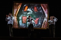 Im Zentrum steht der kleine Angestellte Jonathan Harker, aufgesplittet in drei Schauspieler*innen: der zerrüttete Mensch in der Krise. Wie findet man sich zurecht in einer Welt, in der eine Schrecklichkeit auf die nächste Ungeheuerlichkeit folgt? Was macht man mit der Angst, überwältigt und zerrissen zu werden von den Ereignissen? Wie entwickelt man Hoffnung? Bildstarkes Theater mit einem chorischen, dreifaltigen Jonathan Harker, aus dem weitere Figuren kurz heraus ploppen wie Erinnerungen in Harkers Kopf. Komödie, Tragödie, Schauermärchen. Alles wechselt sich ständig ab, wild und unruhig, so wie die Suche Harkers nach einem Ausweg aus dem Chaos.