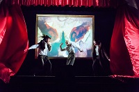 ) Hier aber gelingt es gut, nämlich mit den Mitteln des Theaters. Den armen Jonathan, den auf seinem Weg zum Schloss schauriges Wolfsgetier verfolgt hat, gibt es nämlich gleich drei Mal, chorisch werden Angst und Grusel verhandelt, was der Sache Fahrt verleiht. (