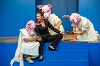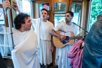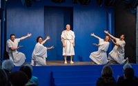 Die Odyssee des Homer als große Sommertheater-Reise. Die Spielorte: die traditionelle Open-Air-Spielstätte Marientor, die Straßenbahn, ein Container beim alten Schlachthof und das Finale im Saal des alten Schlachthofes, der neuen Heimat des Theaters Naumburg. Das Chaos der Welt ist abgebildet in unterschiedlichen Spielweisen und Mitteln. Das Spiel mit verschiedenen Masken trifft auf den Einsatz einer großen Puppe. Körperliche Commedia dell’Arte trifft auf psychologische Ernsthaftigkeit im Showdown. Und worum geht es im Zentrum? Um einen alten, weißen Mann, der irgendwann zugibt, Fehler gemacht zu haben. Dieses Eingeständnis: im Grunde seine größte Heldentat. Eine gebeutelte Mannschaft wird gezeigt, die immer davon ausgeht, dass die erzählten Werte pure Glücksversprechen sind: Erobern, Kampf, Gewinn vermehren.